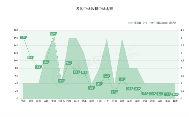 擴展到全部中標(biāo)項目的熱力分布圖,安徽、河北、四川、廣東、貴州等釋放體量較大,尤其是安徽,數(shù)量多,投資金額也大。陜西雖然只有一個項目,但是其金額達到了161億,單體數(shù)額最高,湖北一個項目也有108.3億。