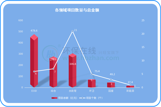 圖中也可以看出,水處理項目仍然是最多的類別,不過EOD項目以及生態(tài)環(huán)境綜合項目雖然數(shù)量少,但項目金額相當(dāng)可觀。