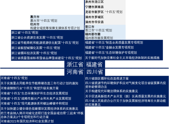 除試點(diǎn)四省外,全國其余省與自治區(qū)均積極響應(yīng)全國“十四五”規(guī)劃對(duì)用能權(quán)市場(chǎng)建設(shè)的要求。如下圖所示,我國大陸所有省份均在省級(jí)規(guī)劃中將用能權(quán)市場(chǎng)列入,在省級(jí)層面對(duì)用能權(quán)市場(chǎng)建設(shè)提供支持,多市在市級(jí)層面出臺(tái)政策與規(guī)劃,進(jìn)一步提高對(duì)用能權(quán)市場(chǎng)建設(shè)的支持力度。有關(guān)政策覆蓋生態(tài)環(huán)境保護(hù)、高碳行業(yè)低碳改造、產(chǎn)業(yè)轉(zhuǎn)型升級(jí)、金融、環(huán)境權(quán)益交易市場(chǎng)協(xié)調(diào)建設(shè)等多個(gè)領(lǐng)域,為我國建設(shè)全國用能權(quán)交易市場(chǎng)以通過市場(chǎng)化手段促進(jìn)產(chǎn)業(yè)提效轉(zhuǎn)型、推動(dòng)綠色發(fā)展具有顯著促進(jìn)作用。