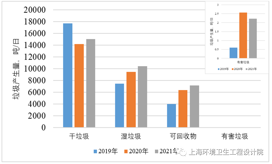 《條例》實(shí)施以來(lái),生活垃圾呈現(xiàn)“三增一減”。據(jù)上海市綠化市容局公布的數(shù)據(jù)表明(圖1),隨著垃圾分類(lèi)工作不斷推進(jìn),濕垃圾分出量、可回收物回收量逐年上升。2021年度,濕垃圾分出量已超過(guò)10000噸/日,占干、濕垃圾總量40%左右,可回收物回收量基本穩(wěn)定在日均7000噸左右,有害垃圾分出量日均2噸以上。
