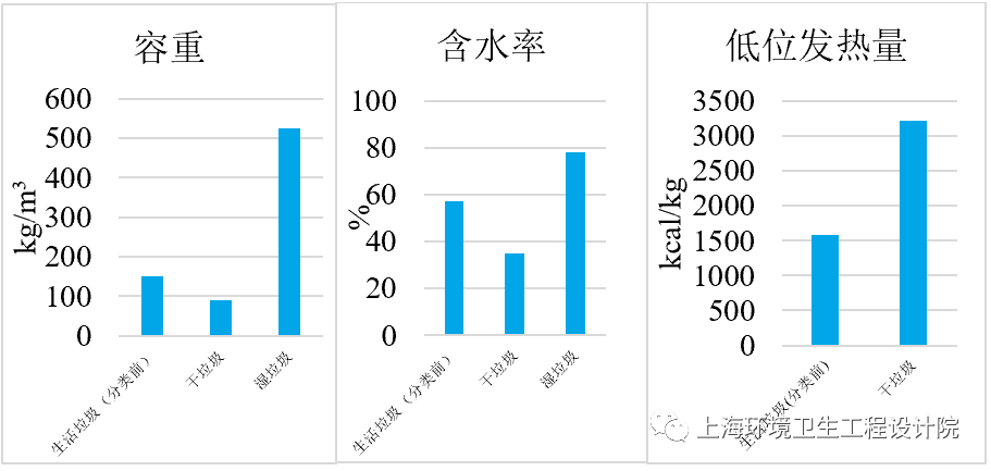 生活垃圾物理組成的變化導(dǎo)致其密度、含水率發(fā)生顯著變化。《條例》實(shí)施前,生活垃圾容重、含水率分別為151 kg/m3、56.96%,低位發(fā)熱量約1580 kcal/kg?!稐l例》實(shí)施后,相比于混合投放,干垃圾容重、含水率均下降約40%,且其低位發(fā)熱量則增到3210 kcal/kg;濕垃圾主要為廚余類(lèi),相比于混合投放,容重增加約247%,含水率增加約37%。干、濕垃圾容重之比約為1∶6,含水率之比約為9∶20。