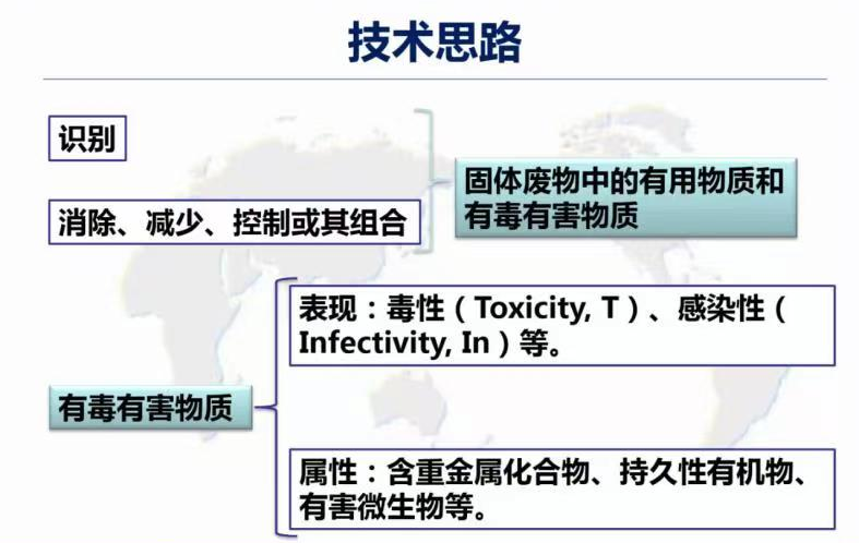 固廢管理的技術(shù)思路分為兩類,一方面應(yīng)識別固廢中的有用物質(zhì)對其進行資源化利用;而另一方面對表現(xiàn)出毒性、感染性等含重金屬化合物、持久性有機物和有害微生物等有毒有害物質(zhì)需著力消除、減少、控制或使用組合措施。廢物處理中通常需要加入能量與化學(xué)物質(zhì),在轉(zhuǎn)化得到產(chǎn)品的同時可能產(chǎn)生大氣排放、水體排放與工藝殘余物,需要關(guān)注與控制。