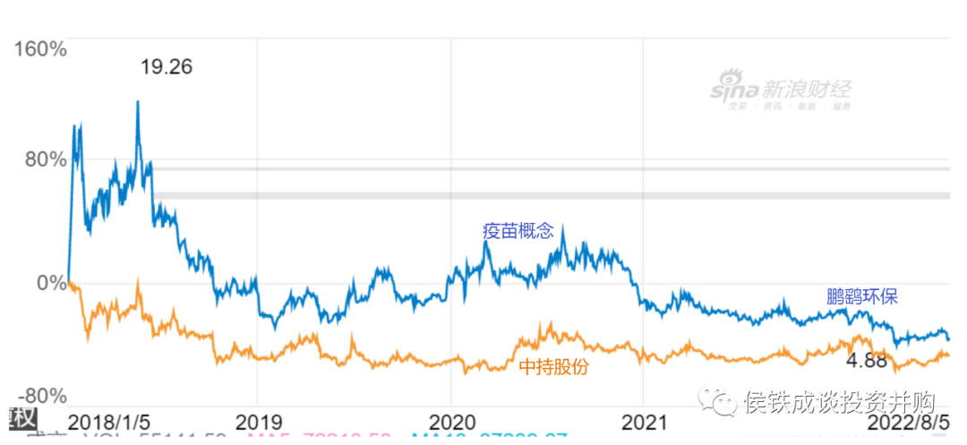 鵬鷂環(huán)保2018年1月份A股上市,增發(fā)8000萬股,融資6個多億。2018年,公司市值借著行業(yè)東風(fēng)達(dá)到150億,然后環(huán)保行業(yè)一路走低,鵬鷂市值也跟著一路下滑。2020年公司投資了疫苗概念股,市值反彈到80億。概念過后,一路走低到今天的38億。