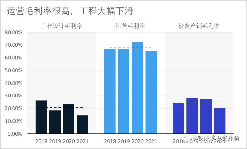 我們再看下各板塊的毛利,工程的收入規(guī)模雖大,但毛利極低。而運(yùn)營板塊是其核心資產(chǎn)。這個也好理解,一般而言工程業(yè)務(wù)輕資產(chǎn),毛利率雖然很低,但凈資產(chǎn)收益率不低。運(yùn)營板塊很多都是重資產(chǎn),凈資產(chǎn)收益率可能很低。