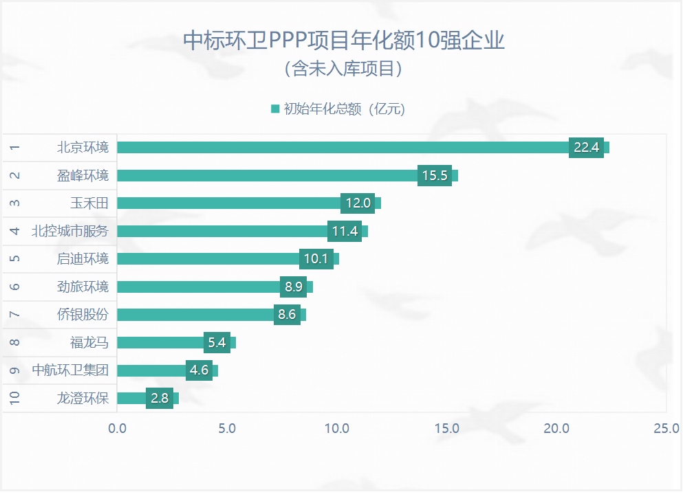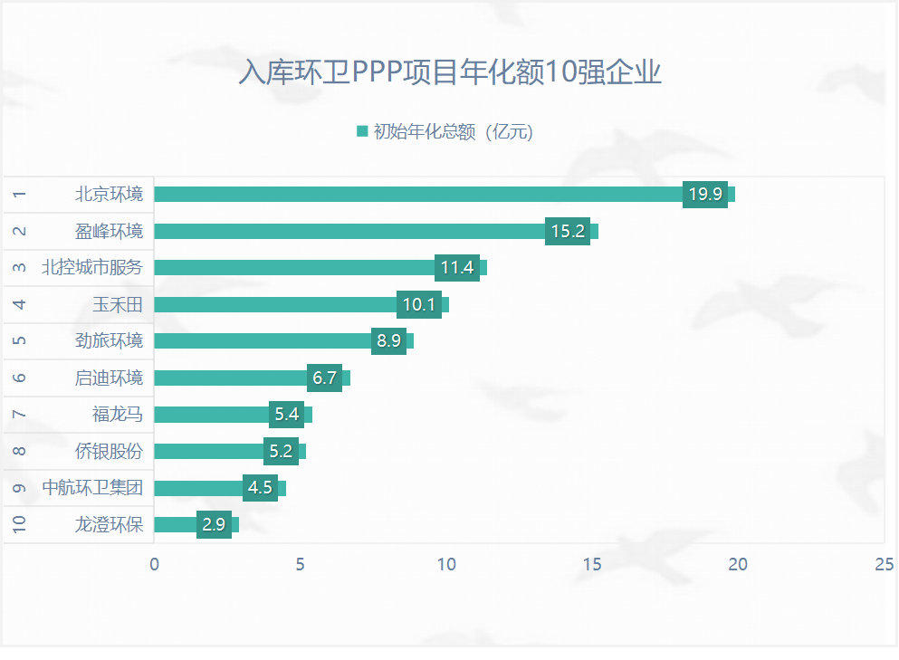 在302個入庫且已開標(biāo)環(huán)衛(wèi)PPP項目中,北京環(huán)境入庫項目年化總額接近20億元(按初始年化額計算),排名第一,占全部已入庫且已開標(biāo)環(huán)衛(wèi)PPP項目年化總額的13%。