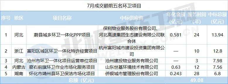 7月成交的環(huán)衛(wèi)項(xiàng)目相對(duì)較少,且只有5個(gè)項(xiàng)目成交額超過5億,前五名環(huán)衛(wèi)項(xiàng)目的成交額近50億,占成交總額的62.5%。