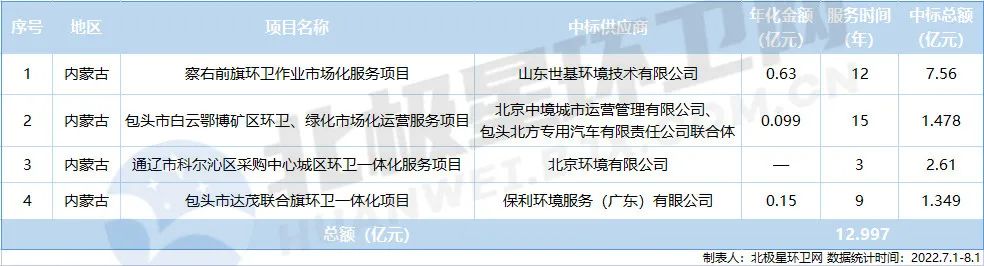 2月,國(guó)投信開水環(huán)境中標(biāo)包頭市昆都侖區(qū)城鄉(xiāng)環(huán)衛(wèi)作業(yè)市場(chǎng)化項(xiàng)目,中標(biāo)金額1.44億元/年,合作期15年,總成交額高達(dá)21.6億元。3月,國(guó)投信開水環(huán)境中標(biāo)包頭市稀土高新區(qū)建成區(qū)及希望園區(qū)環(huán)衛(wèi)市場(chǎng)化項(xiàng)目,成交額4631.16萬元/年,服務(wù)期3年。3月,北京環(huán)境中標(biāo)通遼經(jīng)開區(qū)城區(qū)環(huán)衛(wèi)一體化服務(wù)項(xiàng)目,中標(biāo)金額1.43億元,服務(wù)期3年。5月,山東世基環(huán)境中標(biāo)烏蘭察布市察哈爾高新區(qū)環(huán)衛(wèi)服務(wù)市場(chǎng)化項(xiàng)目,中標(biāo)金額66.93萬元,服務(wù)期1年。5月,河北人和環(huán)境聯(lián)合中境國(guó)際、包頭市保安服務(wù)公司中標(biāo)包頭市東河區(qū)環(huán)衛(wèi)市場(chǎng)化項(xiàng)目,中標(biāo)金額約9259萬元/年,服務(wù)期9年,總金額約8.33億元。6月,河北人和環(huán)境中標(biāo)土默特左旗農(nóng)村人居環(huán)境整治提升服務(wù),中標(biāo)金額1945萬元/6個(gè)月,服務(wù)時(shí)間最多14年+6個(gè)月,中標(biāo)額可達(dá)5.6405億元...