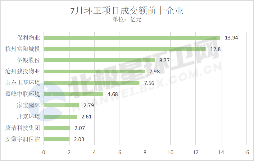 而內(nèi)蒙古市場(chǎng)令人稍感驚喜,7月爆出多個(gè)億級(jí)環(huán)衛(wèi)項(xiàng)目,成交總額約13億元。