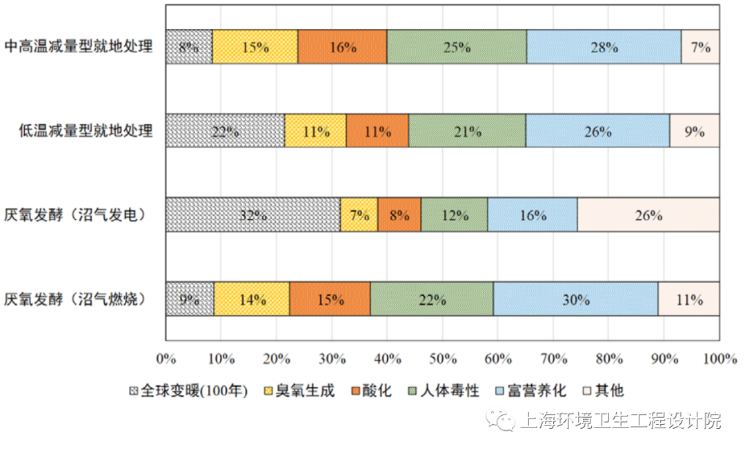 本文對(duì)厭氧發(fā)酵(沼氣燃燒)、厭氧發(fā)酵(沼氣發(fā)電)、低溫減量型就地處理、中高溫減量型就地處理四種典型工藝進(jìn)行了生命周期環(huán)境影響對(duì)比研究。通過(guò)數(shù)據(jù)收集、清單分析和結(jié)果評(píng)價(jià),得出以下結(jié)論: