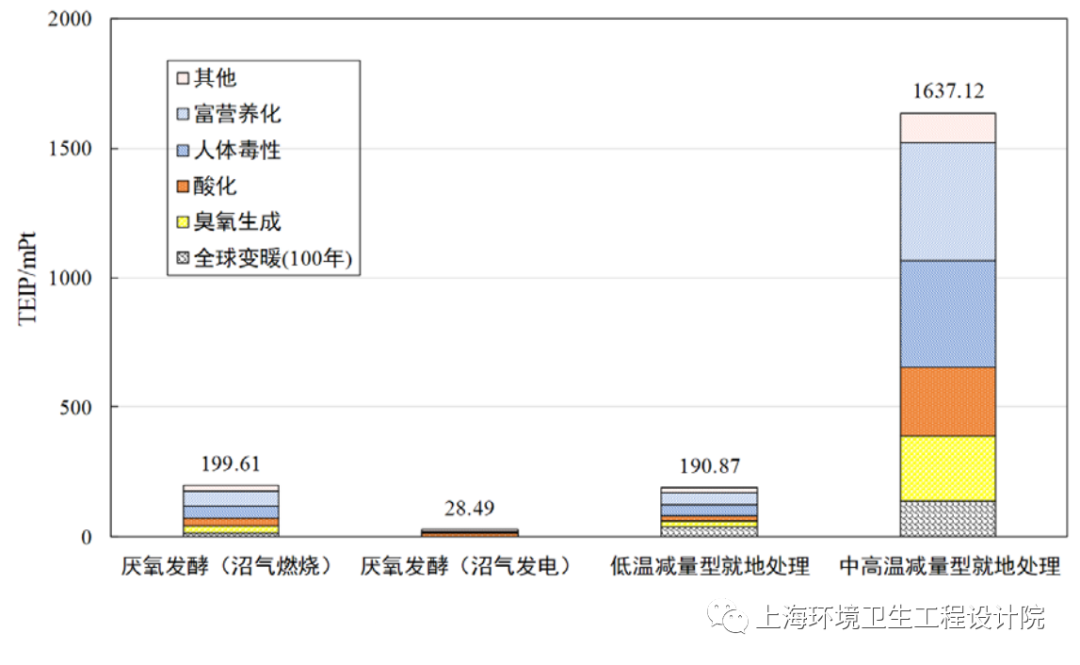 (二)中高溫減量型就地處理工藝的環(huán)境影響最為顯著,主要原因是電耗較高,上游電力生產(chǎn)過(guò)程采用燃煤發(fā)電工藝,其排放的磷和重金屬等導(dǎo)致了較為嚴(yán)重的富營(yíng)養(yǎng)化和人體毒性。
