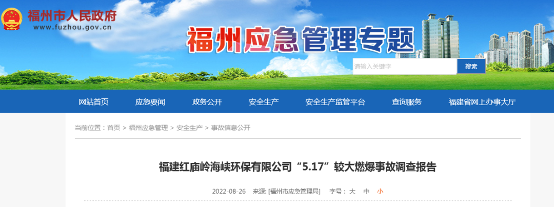 2022年5月17日上午8時54分,福建紅廟嶺海峽環(huán)保有限公司10萬方調節(jié)池上方外包作業(yè)人員違規(guī)用氬弧焊對除臭設施風管漏點進行焊接施工時發(fā)生燃爆,造成3人死亡,3人受傷,5#、6#池頂蓋坍塌,池頂除臭裝置損壞,直接經(jīng)濟損失約1800萬元。事故發(fā)生后,尹力書記、趙龍省長、郭寧寧常務副省長、林文斌副省長等領導第一時間做出重要批示,要求全力搜救失聯(lián)人員,全力搶救受傷人員;嚴格救援現(xiàn)場管控,防止發(fā)生次生災害;查明原因,舉一反三,排查隱患,防范類似事故發(fā)生;做好善后工作。省委常委、市委林寶金書記、省應急廳伍斌廳長、吳賢德市長、省建設廳王明炫副廳長等領導到場指導應急救援。省消防救援總隊高寧宇總隊長、蘇作琴副總隊長率領總隊全勤指揮部到場指揮救援行動。林中麟常務副市長全時指揮市應急局、市消防救援支隊、市城管委、市衛(wèi)健委、市公安局、晉安區(qū)委區(qū)政府及多支民間救援隊進行現(xiàn)場救援。根據(jù)《生產(chǎn)安全事故報告和調查處理條例》(國務院令第493號),經(jīng)市政府授權,市應急管理局牽頭市城管委、市公安局、市總工會、晉安區(qū)政府成立市政府福建紅廟嶺海峽環(huán)保有限公司“5.17”燃爆較大事故調查組(以下簡稱事故調查組),聘請3名專家參與調查,并邀請市紀委監(jiān)委派員參加。事故調查組按照“四不放過”和“科學嚴謹、依法依規(guī)、實事求是、注重實效”的原則,通過現(xiàn)場勘查、技術鑒定、調查取證、專家論證、人員問詢、調閱資料、問題核實和綜合分析,查明了事故發(fā)生的經(jīng)過、原因、應急救援、人員傷亡情況和直接經(jīng)濟損失,認定了事故性質和責任,提出了對相關責任人員及責任單位的處理建議及防范整改措施建議。(一)福建紅廟嶺海峽環(huán)保有限公司。成立于2014年02月21日,注冊資本為500萬人民幣,法定代表人為徐國丹,經(jīng)營狀態(tài)為存續(xù),工商注冊號為350100100368616,注冊地址為福州市晉安區(qū)鼓山鎮(zhèn)洋里路16號綜合樓一樓107室,經(jīng)營范圍包括城市污水處理及其再生利用;垃圾滲瀝液收集及處理、環(huán)境污染治理設施的投資、建設、運營;城市餐廚垃圾處理;環(huán)境污染治理設施運營咨詢服務及技術服務(依法須經(jīng)批準的項目,經(jīng)相關部門批準后方可開展經(jīng)營活動)。為福建海峽環(huán)保集團股份有限公司獨立法人的全資子公司,10萬方新調節(jié)池項目的實際管理單位。(二)福建致辰宇洋環(huán)??萍加邢薰?。成立于2015年3月12日,注冊資本為1000萬人民幣,法定代表人為俞果,經(jīng)營狀態(tài)為存續(xù),工商注冊號為350100100432860,注冊地址為福州市晉安區(qū)新店鎮(zhèn)秀山路245號索高廣場4#樓1層101單元,經(jīng)營范圍包括一般項目:大氣污染治理;水污染治理;生態(tài)環(huán)境監(jiān)測及檢測儀器儀表銷售;大氣污染監(jiān)測及檢測儀器儀表銷售;海洋水質與生態(tài)環(huán)境監(jiān)測儀器設備銷售;環(huán)境保護監(jiān)測;水質污染物監(jiān)測及檢測儀器儀表銷售等(除依法須經(jīng)批準的項目外,憑營業(yè)執(zhí)照依法自主開展經(jīng)營活動)。受福建紅廟嶺海峽環(huán)保有限公司委托對10萬方新調節(jié)池進行除臭設施提升。(三)福建省偉邦市政環(huán)保工程設計研究院有限公司,成立于2006-04-26,注冊資本為300萬人民幣,法定代表人為劉建偉,經(jīng)營狀態(tài)為開業(yè),工商注冊號為350100100173044,注冊地址為福州市鼓樓區(qū)工業(yè)路611號福建高新技術創(chuàng)業(yè)園主樓4層北6房,經(jīng)營范圍包括市政、環(huán)保工程技術咨詢、設計,市政、環(huán)保設備儀器儀表研發(fā)、推廣、銷售,環(huán)保生物廢水處理劑的研發(fā)、推廣、銷售,市政環(huán)保工程承包建設。(依法須經(jīng)批準的項目,經(jīng)相關部門批準后方可開展經(jīng)營活動)。該公司投資入股福建致辰宇洋環(huán)保科技有限公司承攬的10萬方新調節(jié)池的除臭設施提升項目;受福建致辰宇洋環(huán)??萍加邢薰镜姆ㄈ舜碛峁校摴竟こ處熽愡B文負責10萬方新調節(jié)池的除臭設施提升項目具體管理。(四)福州嘉鑫華強金屬制品有限公司。成立于2018-06-15,注冊資本為200萬人民幣,法定代表人為羅維嘉,經(jīng)營狀態(tài)為存續(xù),工商注冊號為350121100236032,注冊地址為福建省福州市閩侯縣祥謙鎮(zhèn)林森大道28號,經(jīng)營范圍包括金屬制品、工藝品、建筑材料、家具的加工;家具、文體用品、日用百貨、五金交電的銷售及通過互聯(lián)網(wǎng)銷售。(依法須經(jīng)批準的項目,經(jīng)相關部門批準后方可開展經(jīng)營活動)。陳連文聯(lián)系該單位為10萬方新調節(jié)池除臭設施提升項目制作配套風管。(五)福州市紅廟嶺垃圾綜合處理中心,該單位為福州市城市管理委員會直屬事業(yè)單位,主要職責為承擔對生活垃圾進行無害化處理和綜合利用工作。設有6個內設機構,其中監(jiān)督一科、監(jiān)督二科、監(jiān)督三科等3個監(jiān)管服務科室負責監(jiān)督檢查園區(qū)內企業(yè)安全生產(chǎn)、環(huán)保等工作。該項目業(yè)主為福州市紅廟嶺垃圾綜合處理中心,市水務集團為代建業(yè)主,新調節(jié)池于2018年12月建成,2020年1月16日市水務集團組織整體