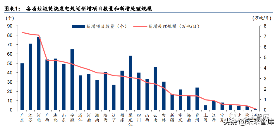 2017 年 12 月 12 日,國(guó)家發(fā)改委聯(lián)合五部委下發(fā)《關(guān)于進(jìn)一步做好生活垃圾焚燒發(fā)電廠規(guī) 劃選址工作的通知》,要求各?。▍^(qū)、市)應(yīng)編制本地區(qū)省級(jí)生活垃圾焚燒發(fā)電中長(zhǎng)期專(zhuān)項(xiàng) 規(guī)劃。截至 2022 年 5 月底,全國(guó)已有 21 個(gè)?。▍^(qū)、市)發(fā)布中長(zhǎng)期專(zhuān)項(xiàng)規(guī)劃及修訂稿, 13 個(gè)省(區(qū)、市)相繼發(fā)布涉及生活垃圾焚燒發(fā)電的“十四五”規(guī)劃,整理后得到 29 個(gè) ?。▍^(qū)、市)規(guī)劃新增項(xiàng)目數(shù)量合計(jì) 974 個(gè),新增處理規(guī)模合計(jì) 84.3 萬(wàn)噸/日。其中,規(guī)劃 新增項(xiàng)目數(shù)量前三的?。▍^(qū)、市)為河北、江蘇和安徽,分別為 78/71/65 個(gè),規(guī)劃新增處 理規(guī)模前三的?。▍^(qū)、市)為廣東、江蘇和河北,分別為 7.4/7.2/7.1 萬(wàn)噸/日。