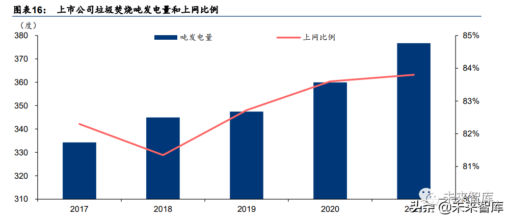 噸發(fā)電量與上網(wǎng)比率的雙重增長(zhǎng)帶動(dòng)噸上網(wǎng)電量顯著提升。將 8 家典型公司的噸發(fā)電量進(jìn) 行整理和計(jì)算,發(fā)現(xiàn) 2017-2021 年噸發(fā)電量由 334 度提升至 377 度,我們認(rèn)為主要有以下 兩方面原因:1)垃圾分類(lèi)帶動(dòng)入爐垃圾熱值水平上升。廚余垃圾含水量高,熱值較低,而 近年來(lái)垃圾分類(lèi)在全國(guó)范圍內(nèi)的推廣,使廚余垃圾與生活垃圾相分離,導(dǎo)致入爐焚燒的廚 余垃圾占比減少;2)爐排爐技術(shù)進(jìn)一步推廣。2016 年全國(guó)垃圾焚燒廠中,使用爐排爐技 術(shù)的焚燒爐占比為 78%,2020 年占比已經(jīng)提升至 85%以上,相比于流化床技術(shù),爐排爐 技術(shù)能使垃圾燃燒的更加充分,從而提升噸發(fā)電量,我們預(yù)計(jì) 2022-2025 年噸發(fā)電量為 379/381/383/385 度。另外,隨著行業(yè)整體運(yùn)營(yíng)水平上升,各企業(yè)致力于生產(chǎn)環(huán)節(jié)節(jié)能降耗, 降低廠用電率,行業(yè)整體上網(wǎng)比率也持續(xù)增長(zhǎng),2018-2021 年間由 81.3%增長(zhǎng)至 83.8%, 我們預(yù)計(jì) 2022-2025 年上網(wǎng)比例逐年提升 0.2 個(gè)百分點(diǎn)至 84.6%。以上雙重因素帶動(dòng)噸上 網(wǎng)電量顯著提升。