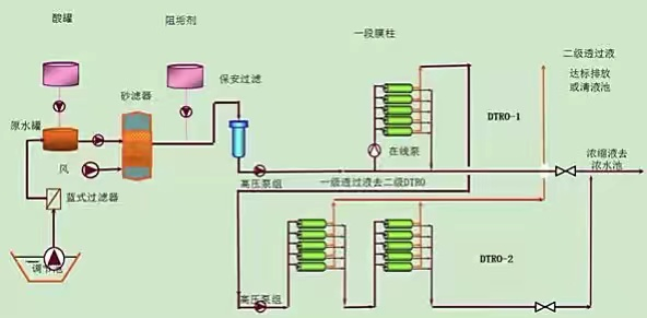 垃圾堆上滲下的滲濾液首先抽到調(diào)節(jié)池,然后從調(diào)節(jié)池抽到藍(lán)式過濾器將飛蟲等過濾,之后進(jìn)入原水罐,原水罐里面自動添加硫酸調(diào)節(jié)酸堿度,此時(shí)硫酸和原水反應(yīng)過程中會生成硫化氫氣體。原水進(jìn)水泵將調(diào)節(jié)好的原水經(jīng)高壓泵打到膜柱過濾,產(chǎn)生的清水進(jìn)入清水罐,經(jīng)過大流量濾芯吸附氨氮、硫化物等后,再經(jīng)離交罐(又名樹脂罐)二次吸附氨氮、硫化物,然后排放至清水池,由水處理站排放。同時(shí)將吸附過濾后剩下的濃縮液打到濃水罐,用濃水泵抽到垃圾堆上,重新滲下循環(huán)處理。