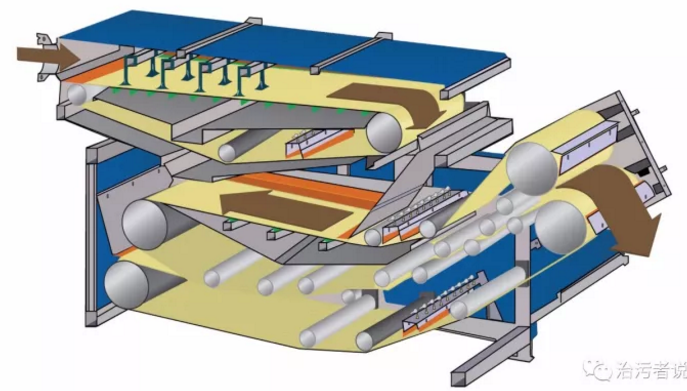先來看比較常用的帶式壓濾機(jī),帶式壓濾機(jī)的發(fā)展也是經(jīng)過單純的壓濾機(jī),然后把化學(xué)濃縮作用也整合到了壓濾機(jī)中,現(xiàn)在的帶式壓濾機(jī),大部分已經(jīng)以濃縮壓濾一體機(jī)的形式出現(xiàn)了,今天我們就以濃縮壓濾一體機(jī)來說明。