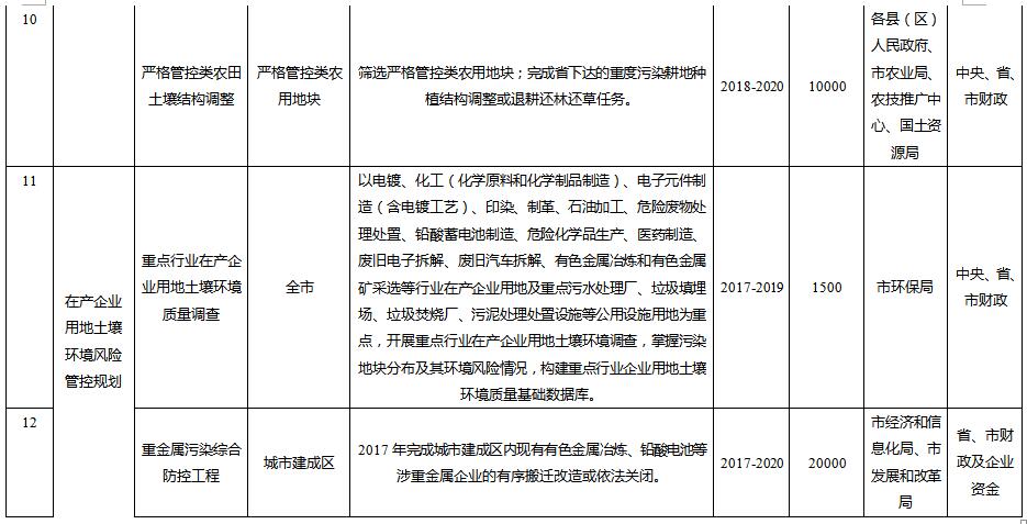 農(nóng)用地土壤分區(qū)分類管控與治理修復(fù)重點項目共10項,需專項資金總計41850萬元;在產(chǎn)企業(yè)用地土壤環(huán)境風(fēng)險管控重點項目共5項,預(yù)計專項資金總計47800萬元;關(guān)閉搬遷企業(yè)地塊土壤治理與修復(fù)項目共3項,預(yù)計專項資金總計14200萬元;垃圾填埋場及周邊環(huán)境整治重點項目共5項,預(yù)計專項資金總計14709萬元;土壤修復(fù)整治重點項目共15項,預(yù)計專項資金總計54600萬元;工業(yè)園區(qū)風(fēng)險防范共2項,預(yù)計專項資金總計8300萬元;土壤污染防治能力提升重點項目共3項,預(yù)計專項資金總計6700萬元。