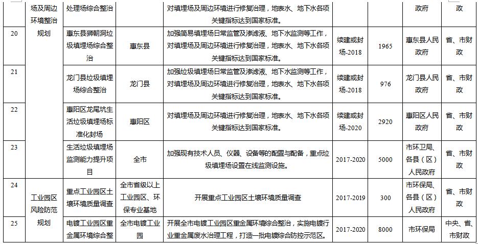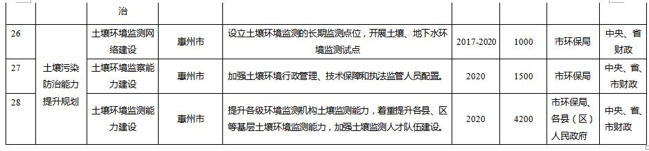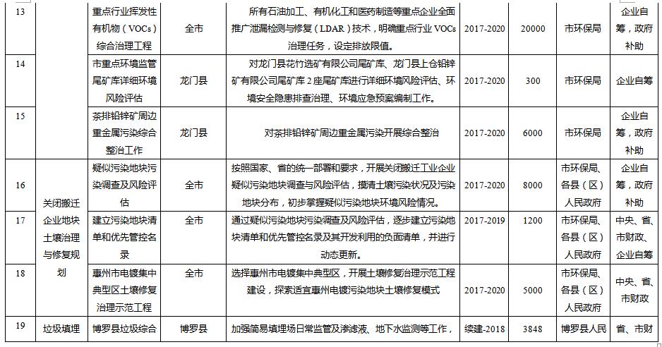 規(guī)劃從惠州市農(nóng)用地土壤分區(qū)分類管控與治理修復(fù)、在產(chǎn)企業(yè)用地土壤環(huán)境風(fēng)險管控、關(guān)閉搬遷企業(yè)地塊土壤治理與修復(fù)、垃圾填埋場及周邊環(huán)境整治、工業(yè)園區(qū)風(fēng)險防范、未利用地保護(hù)、土壤污染防治能力提升等方面建設(shè)6大類重點項目。其中: