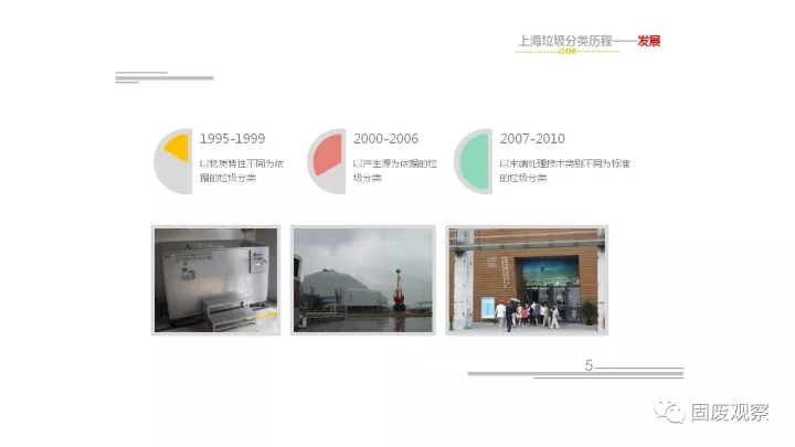 第二階段是發(fā)展階段,從1995年到2010年,上海經(jīng)歷了不同的分類(lèi)標(biāo)準(zhǔn),一直在探索,從一開(kāi)始以物質(zhì)特性為依據(jù)進(jìn)行垃圾分類(lèi),到后來(lái)以產(chǎn)生源為依據(jù)分類(lèi),再到2007年,上海開(kāi)始有了垃圾綜合處理的理念,不單填埋一種處置方法,開(kāi)始有了焚燒和生化處置,因此開(kāi)始了以末端處理技術(shù)類(lèi)別來(lái)分類(lèi)。