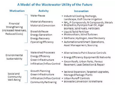 來自于污水管理機構(gòu)這些年來職務角色的自然轉(zhuǎn)變。經(jīng)過近百年的經(jīng)驗累積,除了實現(xiàn)傳統(tǒng)目標之外(去除污染物等),污水管理機構(gòu)還意識到,對于營養(yǎng)物、汞和新興污染物而言,最有效的和最經(jīng)濟的解決方案是直接掌控其處置權(quán),而不是讓更多編外人員插手其中。來自于財政的壓力。在美國的許多缺水地域,特別是西部干旱地區(qū),正逐漸逼近城市水源極限,與此同時,能源成本穩(wěn)步上升,地方政府的預算也因為資產(chǎn)置換成本和實際處理成本的上升而被逐年拉低。在某些情況下,客戶購買廢水服務的能力也有限。因此,“未來污水廠”的關(guān)鍵驅(qū)動因素之一就來自財政壓力。對自愿采取轉(zhuǎn)型的污水管理機構(gòu)而言,從單純的廢水處理轉(zhuǎn)向可持續(xù)的資源管理,都將以降低成本和增加收入的形式帶來凈收益。轉(zhuǎn)型確實可以給環(huán)境、社會、經(jīng)濟帶來好處。環(huán)境方面,減少二氧化碳的排放量,回收資源和能源。節(jié)約產(chǎn)生的效益又將以減緩費率增加和投資的方式反作用于社區(qū),進一步強化服務和改善環(huán)境質(zhì)量。經(jīng)濟方面,企業(yè)將獲得更多的資金來投資工廠和設備以及開展研發(fā)。這部分投資的結(jié)果將為技術(shù)和制造業(yè)創(chuàng)造新的就業(yè)機會,從而帶動一系列實體經(jīng)濟需求,政府也有可能獲得增長的稅收。在當?shù)?,污水管理機構(gòu)可以從這些價值動力中分得紅利,并以需求增加和收入增加的形式回饋給公用事業(yè)。在全國范圍內(nèi),能源自給將會減少進口需求,并拉動更健康的貿(mào)易平衡。