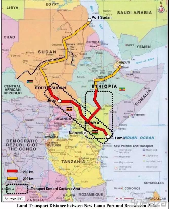 肯尼亞拉穆港-南蘇丹-埃塞俄比亞交通走廊項(xiàng)目(LAPSSET)耗資約250億美元,被認(rèn)為是非洲國家獨(dú)立以來“非洲大陸最大工程”。該項(xiàng)目計(jì)劃建造一個(gè)擁有32個(gè)泊位的深水港,并建設(shè)連接港口與南蘇丹首都朱巴以及埃塞俄比亞首都亞的斯亞貝巴的高速公路、鐵路與輸油管道。新港口將配套建設(shè)煉油廠、倉庫等基礎(chǔ)設(shè)施,此外,還包括在拉穆(Lamu Islands)、伊西奧洛(Isiolo)、洛基察吉奧(Lokichogio)建設(shè)三個(gè)國際機(jī)場(chǎng)。