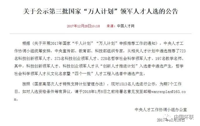 “萬人計(jì)劃”又名“國(guó)家高層次人才特殊支持計(jì)劃”,是一項(xiàng)面向國(guó)內(nèi)高層次人才的支持計(jì)劃。2012年國(guó)家“萬人計(jì)劃”啟動(dòng),目標(biāo)是用10年時(shí)間,遴選1萬名左右自然科學(xué)、工程技術(shù)和哲學(xué)社會(huì)科學(xué)領(lǐng)域的杰出人才、領(lǐng)軍人才和青年拔尖人才,給予特殊支持。其中,“萬人計(jì)劃”領(lǐng)軍人才計(jì)劃支持8000名國(guó)家科技發(fā)展和產(chǎn)業(yè)發(fā)展急需緊缺的創(chuàng)新創(chuàng)業(yè)人才,包括科技創(chuàng)新領(lǐng)軍人才、科技創(chuàng)業(yè)領(lǐng)軍人才、哲學(xué)社會(huì)科學(xué)領(lǐng)軍人才、教學(xué)名師和百千萬工程領(lǐng)軍人才等類別。第三批“萬人計(jì)劃”領(lǐng)軍人才共有1513名各領(lǐng)域?qū)<胰脒x,其中723名科技創(chuàng)新領(lǐng)軍人才、373名科技創(chuàng)業(yè)領(lǐng)軍人才、220名哲學(xué)社會(huì)科學(xué)領(lǐng)軍人才、197名教學(xué)名師人選。