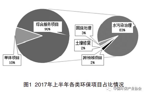 2017年上半年(截至2017年6月30日的數(shù)據(jù),下同),環(huán)境綜合治理項目出現(xiàn)爆發(fā)式增長,樣本上市公 司披露各類中標(biāo)、簽約項目92項,占上半年披露項目總數(shù)的51%,投資總額約1470億元,占上半年披露項目投資總額的89.5%,成為推動環(huán)保市場增長的主要因素。其中,受“河長制度”( 2016年12月,中中央辦公廳、國務(wù)院辦公廳印發(fā)《關(guān)于全面推行河長制的意見》,要求2018年底前全面建立河長制,實現(xiàn)省、市、縣、鄉(xiāng)四級主要領(lǐng)導(dǎo)對水環(huán)境質(zhì)量直接負責(zé))和PPP(政府與社會 資本合作模式)政策的雙重推動,水環(huán)境綜合治理項目增長最多,項目總投資約1365億元;固廢綜合治理項目總投資約43億元;土壤污染綜合治理項目26億元。2017年上半年各類環(huán)保項目占比情況如圖1。