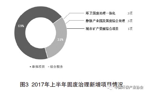 從2017年上半年環(huán)保上市公司披露的項目來看,42個固廢處理項目中,35個單體項目,投資總額97億元;7個綜合項目投資總額43億元。其中,環(huán)衛(wèi)固廢處理一體化項目3個,固廢綜合處理及靜脈產(chǎn)業(yè)園建設(shè)3個。以中國天楹中標(biāo)的寧夏固原市循環(huán)經(jīng)濟產(chǎn)業(yè)園及環(huán)衛(wèi)一 體化項目為例,該項目披露總投資15億元,包含生活垃圾焚燒發(fā)電BOT項目(30年)、餐廚垃圾處置BOT項目(30年)、污泥干化BOT項目(30年)、建筑垃圾循環(huán)利用項目(30年)以及城鄉(xiāng)環(huán)衛(wèi)一體化項目(30年)。 2017年上半年固廢治理新增項目情況如圖3。