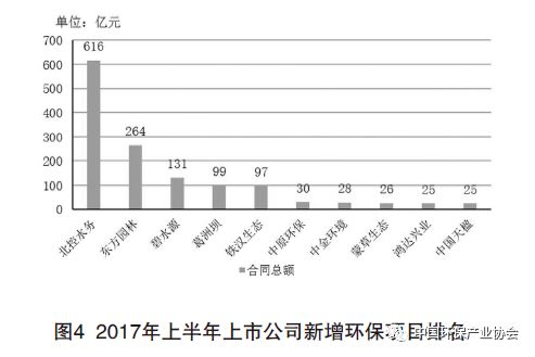 在政策和資本推動下,環(huán)保產(chǎn)業(yè)迅猛發(fā)展,環(huán)保企業(yè)規(guī)模逐漸壯大,拿單能力不斷提升。根據(jù)咨詢公司從公開渠道的資料統(tǒng)計,上半年上市公司披露的環(huán)保項目中,北控水務(wù)簽約中標(biāo)環(huán)保項目15個,投資總額616億元(聯(lián)合體項目由于內(nèi)部投資額分配情況不明,因此按牽頭人統(tǒng)計,例如去年中標(biāo)今年簽約的4個北京市通州區(qū)水環(huán)境治理項目總投資280億元,北控水務(wù)為牽頭人,則全部計入北控水務(wù)投資),其次,東方園林、碧水源等公司也獲得超過百億元的新增項目,拿單能力分化趨勢凸顯。2017年上半年上市公司新增環(huán)保項目排名見圖4。