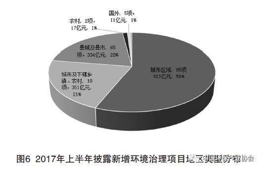 從地域分布來看,貴州、山東、河南、廣東等省市中小城鎮(zhèn)環(huán)保項目總投資額較大??傮w來看,東部地區(qū) 中小城鎮(zhèn)環(huán)保市場活躍,投資額占比超過44.1%,中部地區(qū)占比21.2%,西部地區(qū)占比34.8%。2017年上半年中小城鎮(zhèn)新增環(huán)保項目地區(qū)分布見圖7。