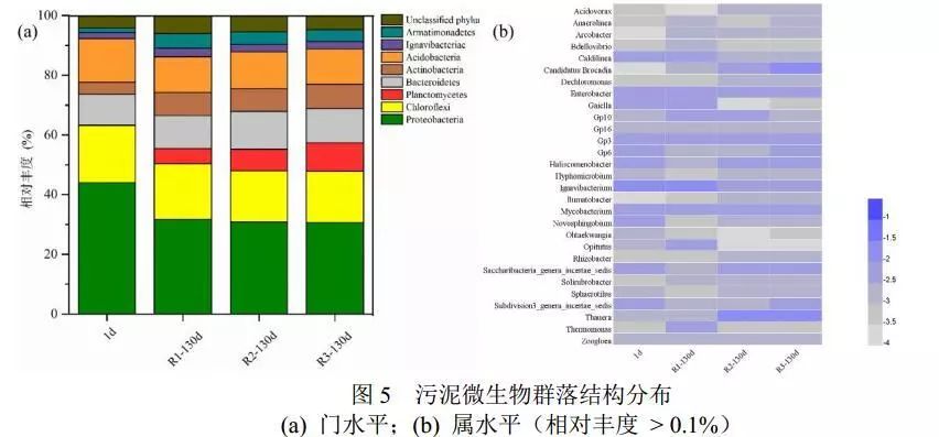 圖5(b)為污泥微生物屬水平熱圖??梢钥闯觯瑓捬醢毖趸鶦andidate Brocadia明顯富集;接種污泥中Candidate Brocadia菌難以檢測其豐度(< 0.01%),經130 d的富集培養(yǎng),對照組R1污泥樣品中厭氧氨氧化菌Candidate Brocadia相對豐度為4.2%,而試驗組R2、R3污泥樣品中其豐度分別為6.8%、8.2%,高于對照組R1。