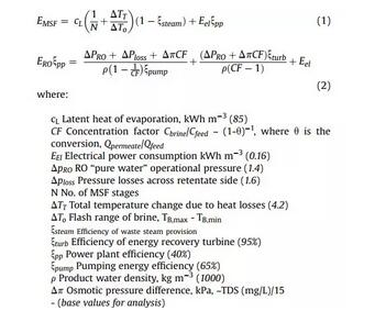 MSF和RO的能耗對比一般用以下公式進(jìn)行計算,其中公式(1)計算MSF熱法淡化的單位能耗,公式(2)則對應(yīng)RO的單位能耗。