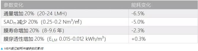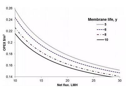 通過對主要參數(shù)的計算對比可以發(fā)現(xiàn),膜通量是OPEX中影響力最高的因子,因為它同時影響了單位能耗和膜更換的成本。