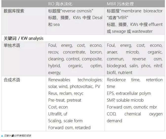 在分析膜技術(shù)的研究趨勢方面,Simon Judd教授使用下表的文獻(xiàn)計量分析方法對RO海水淡化和MBR污水處理的關(guān)鍵詞進(jìn)行了搜索統(tǒng)計。