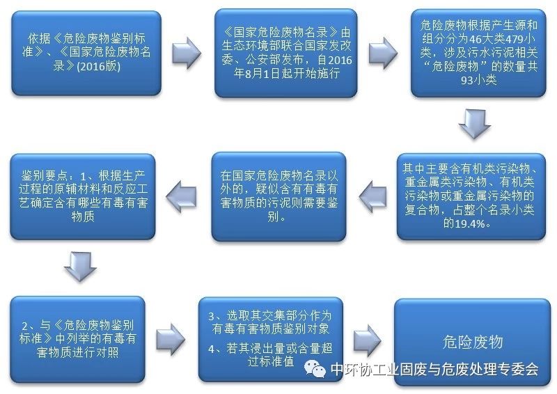 污水污泥是指在污水處理過程中產(chǎn)生的半固態(tài)或固態(tài)物質(zhì)。就環(huán)境保護關(guān)注的問題而言,污水污泥幾乎集聚了污水中所有污染物。按其來源分為工業(yè)污水污泥、生活污水污泥。工業(yè)污水污泥按照管理屬性又分為危險廢物和一般工業(yè)固體廢物。依據(jù)由環(huán)境保護部聯(lián)合國家發(fā)改委、公安部發(fā)布自2016年8月1日起開始施行的《國家危險廢物名錄》和《危險廢物鑒別標準》,結(jié)合住建部、環(huán)保部、科技部于2009年2月28日聯(lián)合發(fā)布的《城鎮(zhèn)污水處理廠污泥處理處置及污染防治技術(shù)政策(試行)》,五步即可判定污水污泥是否屬于危險廢物,如下圖所示: