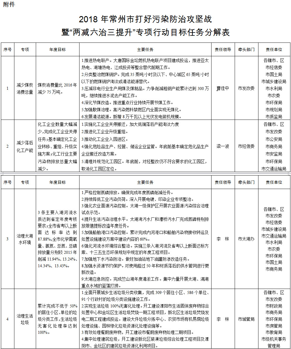市政府關(guān)于印發(fā)《2018年常州市打好污染防治攻堅(jiān)戰(zhàn)暨“兩減六治三提升”專項(xiàng)行動(dòng)工作方案》的通知