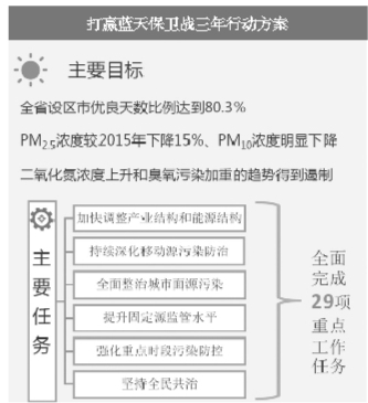 據(jù)了解,新《三年行動(dòng)方案》計(jì)劃用3年時(shí)間,通過(guò)調(diào)整產(chǎn)業(yè)結(jié)構(gòu)、優(yōu)化能源結(jié)構(gòu)、完善交通運(yùn)輸結(jié)構(gòu)、狠抓重污染天氣應(yīng)對(duì)等措施,全面完成29項(xiàng)重點(diǎn)工作任務(wù),讓全省的環(huán)境空氣質(zhì)量不斷改善。到2020年,全省設(shè)區(qū)市優(yōu)良天數(shù)比例達(dá)到80.3%,PM2.5濃度較2015年下降15%,PM10濃度明顯下降,重污染天數(shù)明顯減少,二氧化氮濃度上升和臭氧污染加重的趨勢(shì)得到遏制,二氧化硫、一氧化碳年均濃度基本達(dá)到國(guó)家環(huán)境空氣質(zhì)量二級(jí)標(biāo)準(zhǔn)。