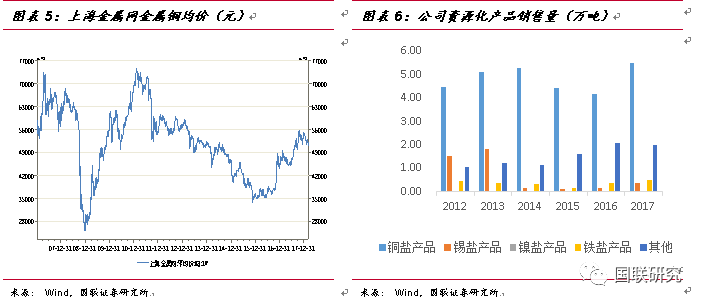 公司工業(yè)廢物資源化利用業(yè)務(wù)亦為公司重要主營業(yè)務(wù)之一。由于資源化業(yè)務(wù)不僅受到產(chǎn)能和產(chǎn)品銷量影響,還與大宗商品的價(jià)格波動(dòng)息息相關(guān)。公司資源化產(chǎn)品主要包括銅鹽、錫鹽、鎳鹽和鐵鹽產(chǎn)品等。2016年前,受到國際基本金屬價(jià)格下跌、行業(yè)競爭加劇的影響,公司資源化業(yè)務(wù)營收略有下降。2012至2016年,公司資源化業(yè)務(wù)營收由9.39億元降低至7.91億元,毛利率維持在30%左右,而2017年,公司資源化業(yè)務(wù)營收11.82億,同比增長49.33%,主要是因?yàn)楦骰刭Y源化產(chǎn)銷量增加、重金屬價(jià)格上升、加之公司加大海外銷售等。