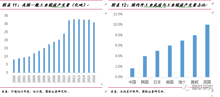 危廢實(shí)際產(chǎn)生量遠(yuǎn)高于生態(tài)環(huán)境部統(tǒng)計(jì)值。對(duì)于我國危廢實(shí)際產(chǎn)生量,我們認(rèn)為可以采用以下兩種方式進(jìn)行測算:①對(duì)比發(fā)達(dá)國家危廢產(chǎn)量測算法:2007-2016年我國一般工業(yè)固廢產(chǎn)量由17.6億噸增長到30.9億噸,年復(fù)合增長率為6.45%。對(duì)比部分發(fā)達(dá)國家的危廢與工業(yè)固廢占比可以發(fā)現(xiàn),韓國為4%,日本5%,英國比例最高為10%,而中國的比例僅為1.7%,差距較為明顯。即使按照韓國4%的危廢占工業(yè)固廢比例進(jìn)行保守測算,2016年我國危廢實(shí)際產(chǎn)量預(yù)估將達(dá)1.24億噸。