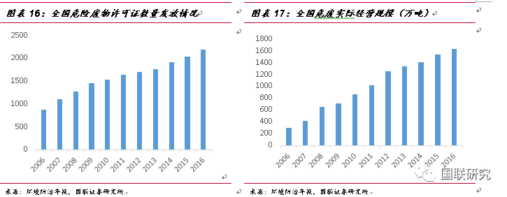 在一系列環(huán)保政策的刺激下,危廢處置行業(yè)需求將逐步迎來有效釋放。根據(jù)《2017年全國大、中城市固體廢物污染環(huán)境防治年報(bào)》統(tǒng)計(jì)數(shù)據(jù)顯示,截至2016年底,全國各省(區(qū)、市)頒發(fā)的危廢(包含醫(yī)療廢物)經(jīng)營許可證共計(jì)2195份,核準(zhǔn)經(jīng)營規(guī)模為6471萬噸/年(含收集經(jīng)營規(guī)模397萬噸/年)。而根據(jù)環(huán)境防治年報(bào),2016年實(shí)際經(jīng)營規(guī)模為1629萬噸(含收集23萬噸),有效處理能力較低,大量的產(chǎn)能仍未完全釋放。