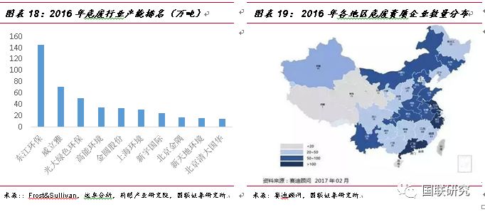 行業(yè)集中度低、規(guī)模小,公司處于絕對(duì)領(lǐng)先地位。我國的危廢行業(yè)的市場參與者眾多,但是具有規(guī)模效應(yīng)的企業(yè)很少,目前我國危廢行業(yè)呈現(xiàn)出的特征主要有以下幾點(diǎn):①行業(yè)集中度低:根據(jù)Frost&Sullivan、遠(yuǎn)卓分析、前瞻產(chǎn)業(yè)研究院的統(tǒng)計(jì)數(shù)據(jù),截止 2016 年,行業(yè)內(nèi)排名前十大公司僅占總設(shè)計(jì)處置能力的6.8%,其中東江環(huán)保市占率為2.26%,處絕對(duì)領(lǐng)先地位;②危險(xiǎn)廢物產(chǎn)生量與處理能力分布不匹配。2016年我國持危險(xiǎn)廢棄物經(jīng)營許可證的企業(yè)數(shù)量為2149家,主要集中于長三角和珠三角區(qū)域,欠發(fā)達(dá)地區(qū)許可證數(shù)量少。其中江蘇、浙江和廣東三省資質(zhì)企業(yè)數(shù)量共計(jì)503家,占全國總數(shù)的30%以上。根據(jù)Frost&Sullivan的數(shù)據(jù),2015年危險(xiǎn)廢物產(chǎn)生量主要集中在東部、西北部、中部,分別占總產(chǎn)生量的31%、24%,13%,可以看出華東地區(qū)及西北地區(qū)占危險(xiǎn)廢物產(chǎn)生量的大部分。而經(jīng)濟(jì)發(fā)達(dá)地區(qū)如華東及華南占危險(xiǎn)廢物處理能力的大部分。危廢處置行業(yè)中,東江環(huán)保、光大國際、威立雅中國、新宇國際等企業(yè)進(jìn)入行業(yè)較早,經(jīng)過多年的發(fā)展已經(jīng)具備規(guī)模和產(chǎn)能優(yōu)勢,而且位于危廢產(chǎn)生量較大的省份,有較強(qiáng)的客戶資源和競爭優(yōu)勢。③經(jīng)營企業(yè)規(guī)模小、處理能力弱。按照2016年核準(zhǔn)經(jīng)營規(guī)模和企業(yè)數(shù)量的數(shù)據(jù)測算,平均每家的核準(zhǔn)處理能力僅為3萬噸/年,并且大部分企業(yè)技術(shù)、資金等實(shí)力較弱,日均處理能力超過50噸的企業(yè)占比不到20%,達(dá)到1000噸的僅占0.3%,并且能夠處理25種以上危廢種類的企業(yè)僅為1%,絕大多數(shù)均小于10種。在2017年,東江環(huán)保已具備44類危險(xiǎn)廢物經(jīng)營資質(zhì),在危廢行業(yè)中處于絕對(duì)領(lǐng)先地位。
