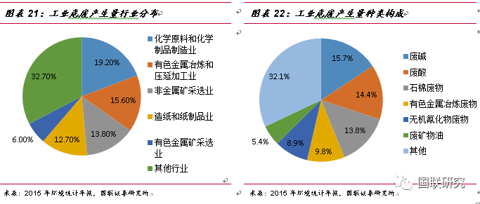 工業(yè)危廢的主要來源及種類構(gòu)成。鑒于對(duì)危險(xiǎn)廢物的認(rèn)識(shí)不斷深入,在2016年6月21日,生態(tài)環(huán)境部重新修訂了《國家危險(xiǎn)廢物名錄》,將危廢由49大類重新調(diào)整為46大類,新增117種類別,共計(jì)479種,而其中70%以上的危廢都來自于工業(yè)行業(yè)。據(jù)2015年環(huán)境統(tǒng)計(jì)年報(bào)數(shù)據(jù)統(tǒng)計(jì),工業(yè)危廢中產(chǎn)量最大的行業(yè)分別為化學(xué)原料與化學(xué)制品制造業(yè)(占比19.2%)、有色金屬冶煉和壓延加工(占比15.6%)、非金屬礦采選業(yè)(占比13.8%)以及造紙和紙制品業(yè)(占比12.7%)。