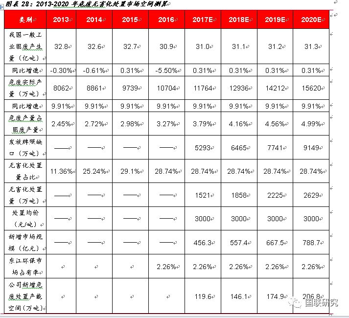 無害化處置市場潛力巨大,公司成長空間廣闊。我們預(yù)計(jì)在2018-2020年,全國危廢實(shí)際產(chǎn)量將會(huì)持續(xù)增長,約為1.3-1.56億噸,截至2016年底,全國各省(區(qū)、市)頒發(fā)的危廢(包含醫(yī)療廢物)經(jīng)營許可證共計(jì)2195份,核準(zhǔn)經(jīng)營規(guī)模為6471萬噸/年(含收集經(jīng)營規(guī)模397萬噸/年)。我們通過測算未來危廢實(shí)際產(chǎn)量與現(xiàn)有核準(zhǔn)規(guī)模的缺口,按無害化處置比例28.74%,3000元/噸的平均處置價(jià)格進(jìn)行測算,則預(yù)計(jì)到2020年,危廢無害化處置行業(yè)缺口將有望達(dá)到788.7億元。對(duì)于東江環(huán)保,2016、2017年危廢處置總產(chǎn)能分別為146萬噸、160萬噸,按照16年核準(zhǔn)經(jīng)營規(guī)模6471萬噸/年進(jìn)行計(jì)算,市場占有率在2.26%,假設(shè)市占率保持不變,對(duì)應(yīng)的公司2020年新增危廢處置總產(chǎn)能的空間(包含資源化、無害化)大約是206.8萬噸,合計(jì)總產(chǎn)能規(guī)模達(dá)到352.8萬噸,較目前公司的產(chǎn)能規(guī)模160萬噸仍有較大的增長空間。