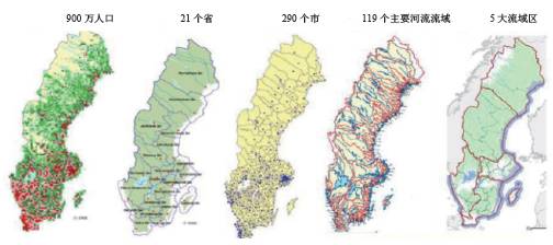 2000年,《歐盟水框架指令》開(kāi)始實(shí)施,歐盟各成員國(guó)的水資源管理工作的開(kāi)展更協(xié)調(diào)、更統(tǒng)一。自2004年起,為了更有效地管理水環(huán)境,瑞典被劃分為五大水資源區(qū)(如圖1、2所示),每個(gè)區(qū)包含多個(gè)江河流域。瑞典總共有119個(gè)主要的江河流域,這些流域是地方水資源管理工作的起點(diǎn)。這五大水資源區(qū)是按照它們與海床的地理區(qū)域關(guān)系劃分的,這些海床包括:波的尼亞灣區(qū)、波的尼亞海區(qū)、北波羅的海區(qū)、南波羅的海區(qū)、斯卡格拉克與卡特加特海峽區(qū)等。此后瑞典在五大水資源區(qū)開(kāi)展水資源管理工作。