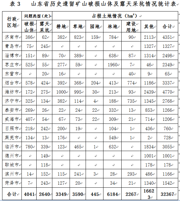 全省露天開采礦種主要有石灰?guī)r、花崗巖、磚瓦用粘土等非金屬建筑材料礦產(chǎn),在開采過程中造成了地形地貌景觀破壞,也占?jí)汉蛽p毀了大量的土地資源。目前,全省尚有破損山體4706處、露天采坑3109處,占損土地資源總計(jì)4.28萬公頃。其中,歷史遺留礦山破損山體4041處、露天采坑2640處,占損土地資源3.24萬公頃,主要分布在濟(jì)南、煙臺(tái)、濰坊、臨沂等地(表3);生產(chǎn)礦山造成的破損山體665處、露天采坑469處,占損土地資源1.04萬公頃,主要分布在煙臺(tái)、泰安、臨沂等地。