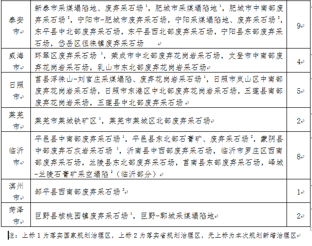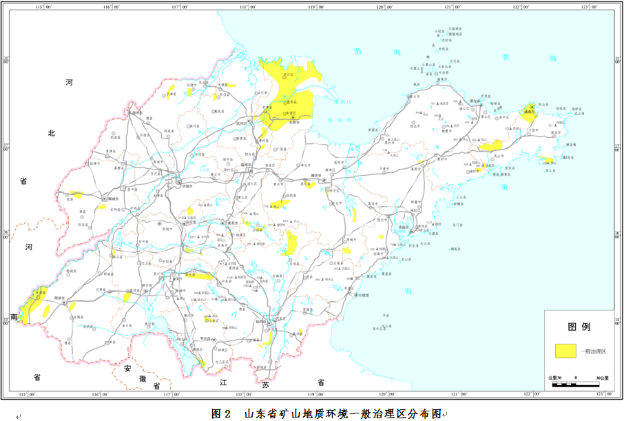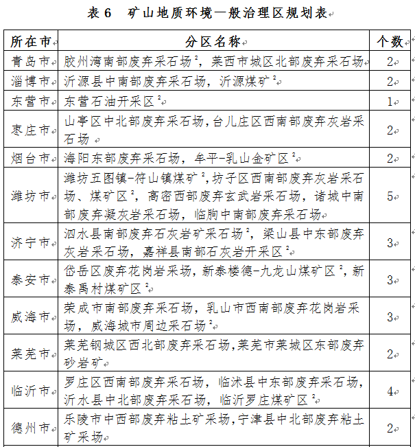 根據(jù)山東省礦山地質(zhì)環(huán)境調(diào)查最新成果,結(jié)合《全國(guó)礦產(chǎn)資源規(guī)劃》《山東省礦產(chǎn)資源總體規(guī)劃》中有關(guān)礦山地質(zhì)環(huán)境治理分區(qū)結(jié)果,充分考慮重點(diǎn)礦山地質(zhì)環(huán)境問題發(fā)育現(xiàn)狀和影響范圍,劃分礦山地質(zhì)環(huán)境重點(diǎn)治理區(qū)和一般治理區(qū)。