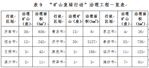 2013年全省編制實(shí)施了《山東省礦山復(fù)綠行動(dòng)實(shí)施方案》,共確定治理礦山400座,目前已治理完成254座,146座未完成。部署到2020年治理礦山146座,治理面積0.75萬公頃(含采煤塌陷地0.44萬公頃,“三區(qū)兩線”可視范圍內(nèi)歷史遺留礦山0.15萬公頃),主要分布于濟(jì)南、煙臺(tái)、濟(jì)寧、泰安等地(表9)。