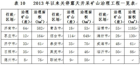 2013年以來全省關(guān)停露天開采礦山1539座,已治理礦山267座,未治理礦山1272座。部署到2020年治理礦山518座,治理面積0.33萬公頃(含“三區(qū)兩線”可視范圍內(nèi)歷史遺留礦山0.09萬公頃),主要分布于濟(jì)南、淄博、煙臺(tái)等地(表10)。