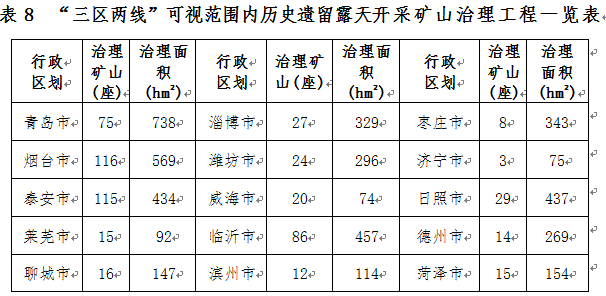 部署開展“三區(qū)兩線”可視范圍內(nèi)歷史遺留露天開采礦山地質(zhì)環(huán)境治理工程,到2020年治理歷史遺留露天開采礦山577座,治理面積0.45萬公頃,主要分布于青島、煙臺(tái)、泰安、日照、臨沂等地(表8)。