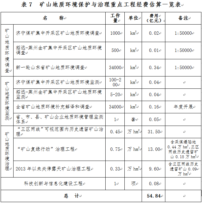 在濟(jì)寧煤礦集中開采區(qū)、招遠(yuǎn)-萊州金礦集中開采區(qū)開展礦山地質(zhì)環(huán)境專項(xiàng)調(diào)查,在全省開展新一輪礦山地質(zhì)環(huán)境詳細(xì)調(diào)查。調(diào)查費(fèi)用估算為0.37億元。