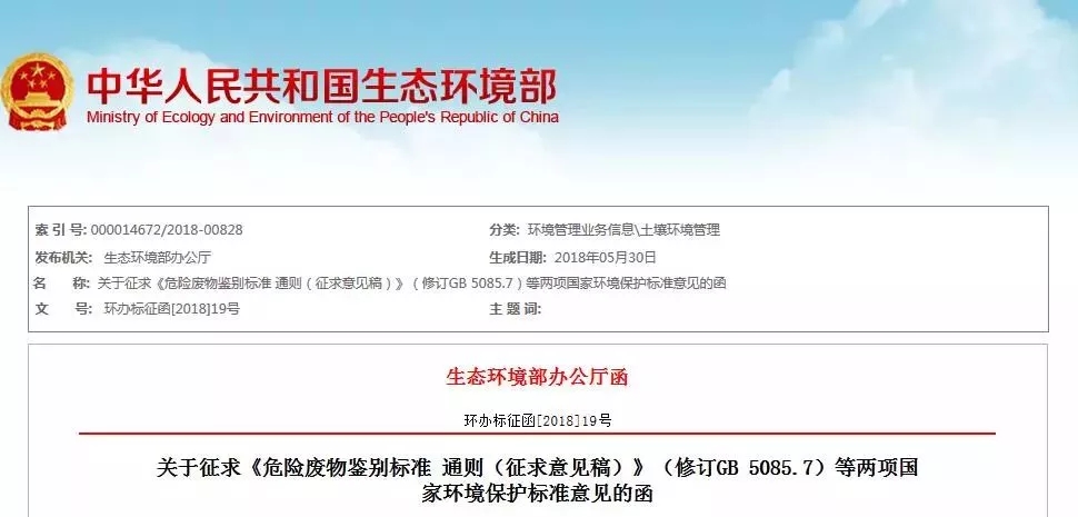 關(guān)于征求《危險(xiǎn)廢物鑒別標(biāo)準(zhǔn) 通則(征求意見稿)》(修訂GB5085.7)等兩項(xiàng)國家環(huán)境保護(hù)標(biāo)準(zhǔn)意見的函